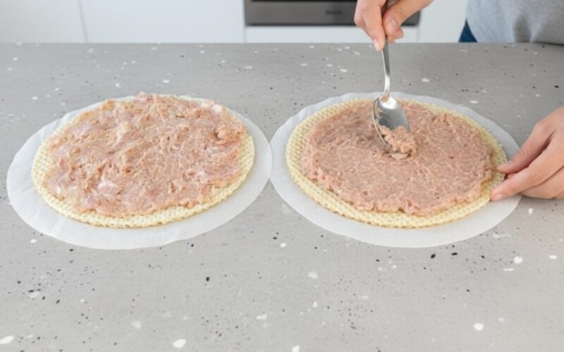 2. 7 minutė: Faršą tolygiai paskirstykite ant 4 vaflinių lakštų. Svarbu tai daryti prieš pat gaminimą, kad lakštai nesuminkštėtų. Sujunkite du lakštus tarpusavyje, sustiprindami mėsos įdaru. Turėtų gautis du vafliniai „pyragėliai” su mėsos įdaru.