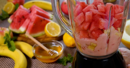 Rytinis kokteilis – arbūzas, jogurtas, sauja špinatų. Sumaišyti blenderiu – užtrunka 2 minutes.