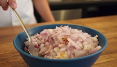 - Raudoną svogūną supjaustykite plonais griežinėliais. Kad sumažintumėte aštrumą, galite svogūną 5 minutes pamirkyti šaltame vandenyje, tada nusausinti.