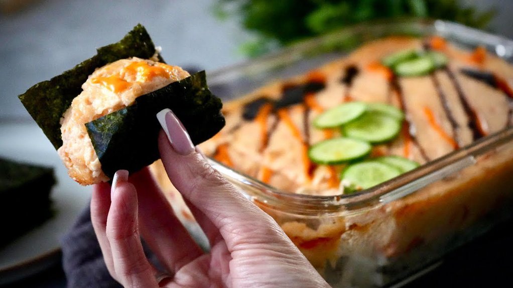 Įsivaizduokite visus mėgstamus suši skonius vienoje lėkštėje: lipnius ryžius su acto rūgštumu, traškų nori, kreminį lašišos ir majonezo įdarą, šviežią avokadą ir agurką. Tik vietoj kruopštaus sukimo – paprastas sluoksniavimas kepimo formoje.