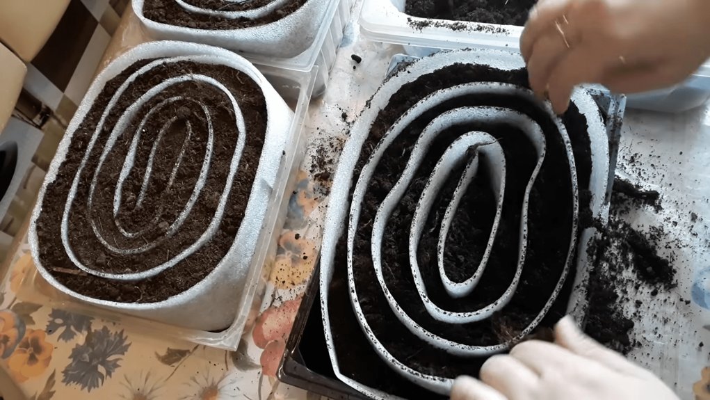 Kai sraigė susukta – sustato ją vertikaliai į bet kokį indą. Tinka senas puodas, plastikinis kibiras, net pjaustymo lentelė su kraštais. Gaunasi kompaktiškas ritinys su dešimtimis atskirų skyrelių viduje. Vienas toks ritinys užima tiek vietos, kiek trys puodeliai – bet talpina penkiolika–dvidešimt daigų.