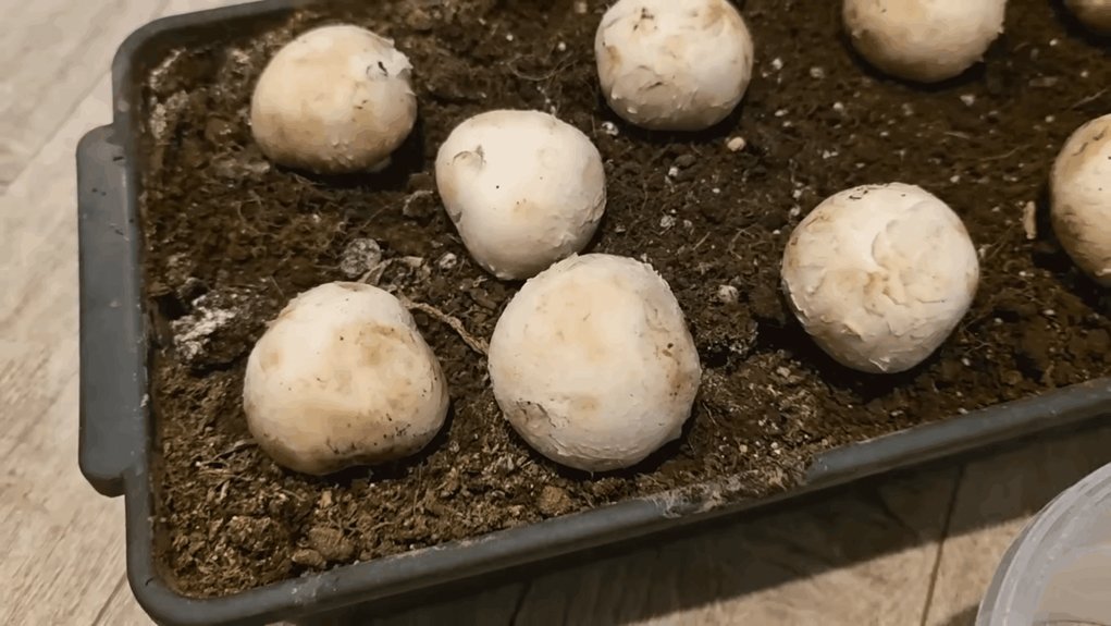 Ant substrato paviršiaus pradeda rastis mažytės baltos pintelės — būsimų grybų užuomazgos. Nuo šio momento svarbu kasdien stebėti augimą, purkšti orą aplink maišą (ne patį substratą), kad palaikytumėte drėgmę, ir suteikti keletą valandų difuzinės šviesos per dieną.