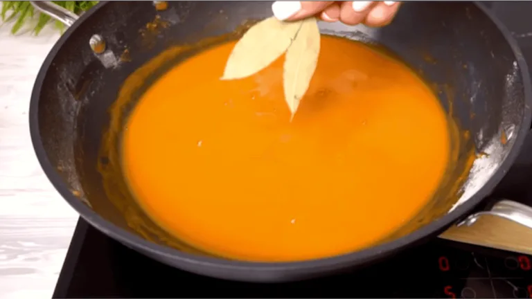- Nukelkite nuo kaitlentės, išimkite lauro lapą ir palikite padažą porai minučių pastovėti – jis dar šiek tiek sutirštės.