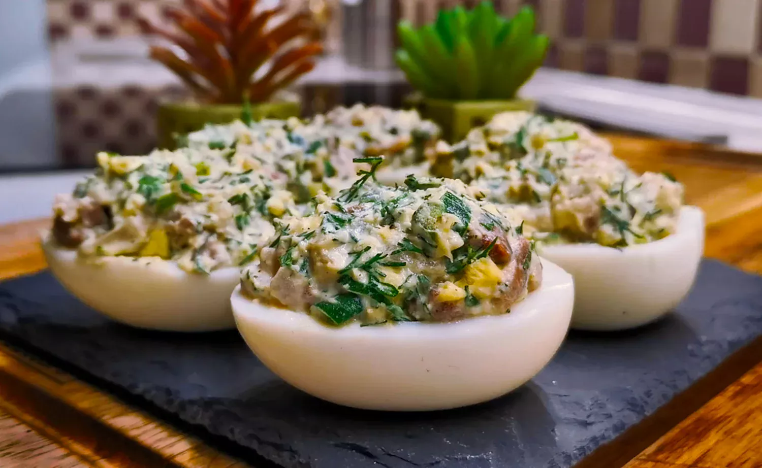 Virtus kiaušinius perpjaukite per pusę išilgai. Atsargiai išimkite trynius taip, kad baltymas liktų sveikas – jis bus mūsų pagrindas, tarsi mažas krepšelis įdarui. Trynius susmulkinkite taip pat smulkiai kaip silkę ir sudėkite į salotinę pas silkę.