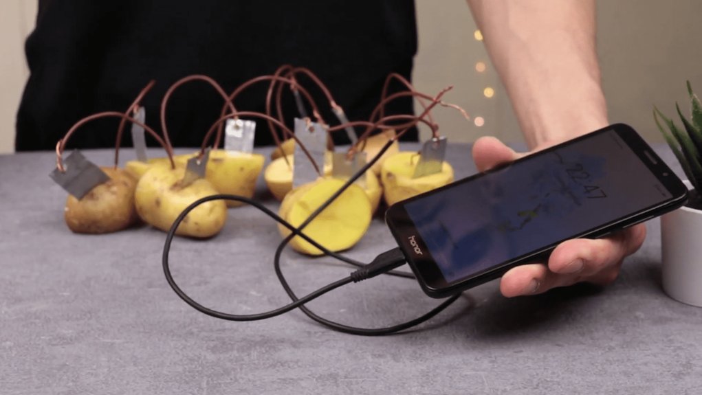 Penkios bulvės teoriškai turėtų duoti apie 4 voltus. Praktikoje gavau 3,7 – pakankamai, kad telefonas atpažintų įkrovimo šaltinį.