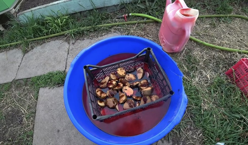 Į dešimt litrų vandens įpilu šimtą mililitrų vandenilio peroksido, šimtą mililitrų sukcino rūgšties ir keturiasdešimt mililitrų beržų dervos. Gerai išmaišau medinę lazdele. Tada kiekvieną sėklinę bulvę panardinu į šį tirpalą keturioms–penkioms minutėms. Ne ilgiau – nes tada gali pažeisti audinius.