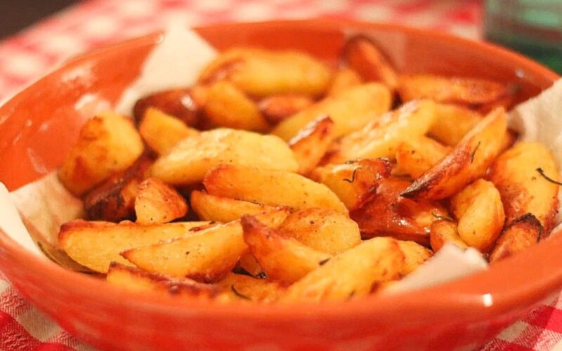- Sumažinkite ugnį iki vidutinės ir kepkite dar 10-15 minučių, vartydami kas 5-7 minutes, kol bulvės taps auksinės spalvos ir traškios.