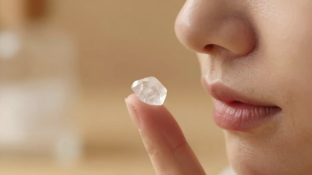 Birutė parodė tiksliai. Ima mažą žiupsnelį – maždaug tiek, kiek tilptų ant piršto galiuko. Deda po liežuviu ir laiko kelias sekundes. Tada geria stiklinę vandens.