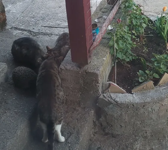 Išėjau į kiemą ir sustingau. Prie laiptų, šalia gėlių lysvės, sėdėjo dvi katės – ir tarp jų, visiškai ramiai, tupėjo ežiukas. Ne bėgo, nesisuko į kamuolį, nestatė spyglių. Tiesiog sėdėjo. O katės – nei pūtė, nei šnypštė, nei bandė liesti. Visos trys būtybės tiesiog buvo kartu, tarsi tai būtų normaliausia pasaulyje.