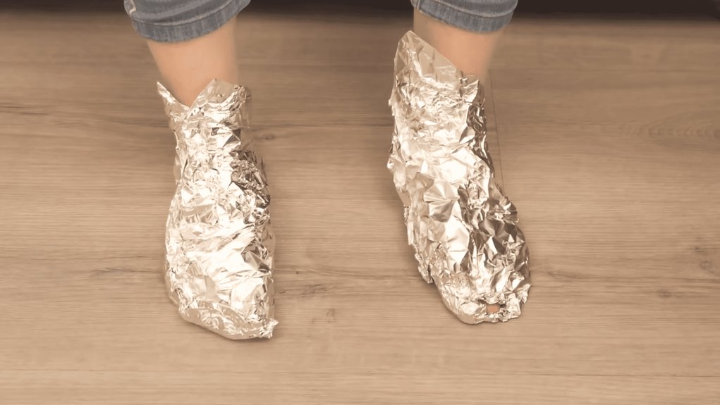 Pasirinkite pakankamai didelį folijos gabalą, kad visiškai apdengtumėte pėdą. Vyniokite tvirtai aplink visą pėdą – įskaitant kulną ir tarp pirštų. Jokių tarpų ar plyšių, kurie sumažintų izoliaciją.