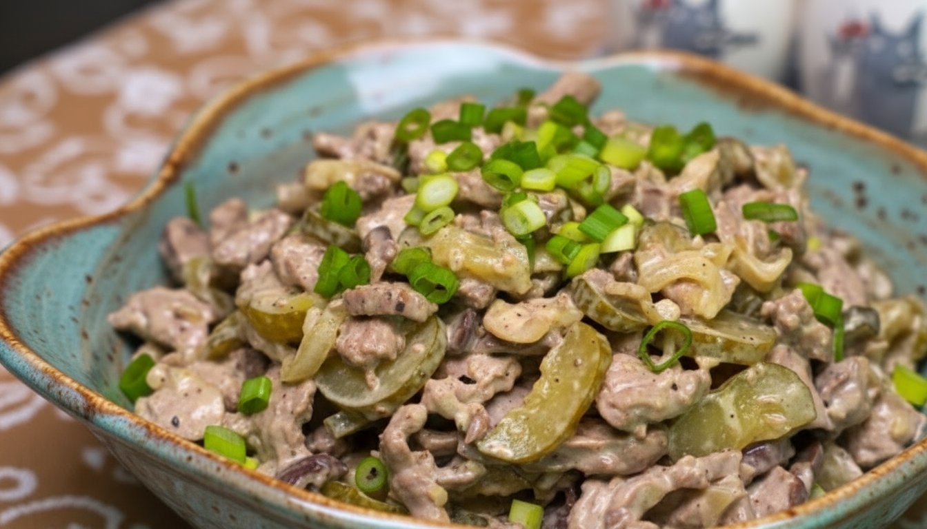 Subproduktą sukapojame į mažus gabalėlius, sumaišome salotinėje su agurkais ir svogūnais. Užpilame salotas majonezu ir kruopščiai išmaišome.