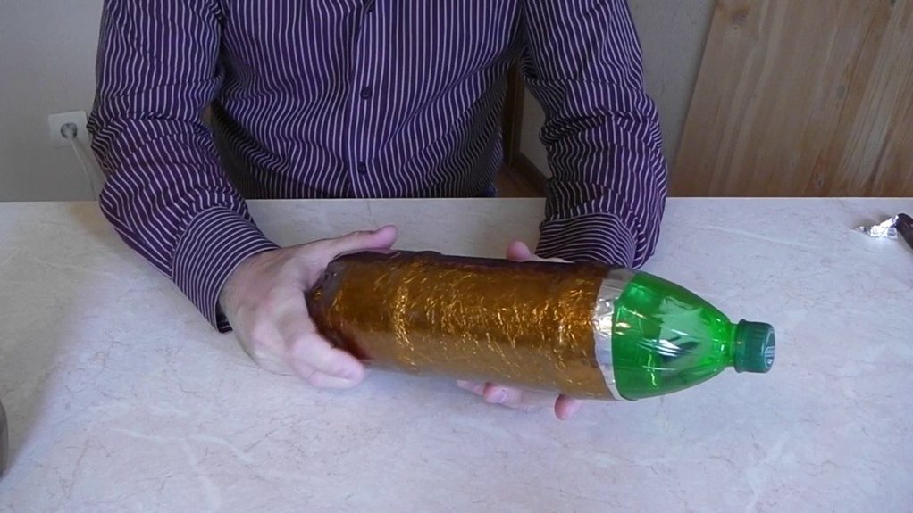 Viskas, ko reikia – tai 1,5 litro plastikinis butelis (geriausiai PET), stiklainis su užsukamu dangteliu ir aliuminio folija. Būtent folija atlieka pagrindinį vaidmenį: ji veikia kaip atspindinti izoliacija, neleidžianti šilumai išsisklaidyti.