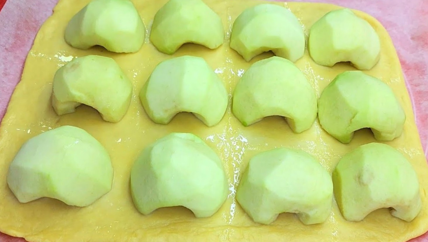 Nulupame obuolių odelę ir išimame sėklų lizdus, kiekvieną obuolį padalijame į dvi dalis. Tešlą padalijame į dvi dalis, abu rutulius iškočiojame į vienodo dydžio kvadratinius lakštus.