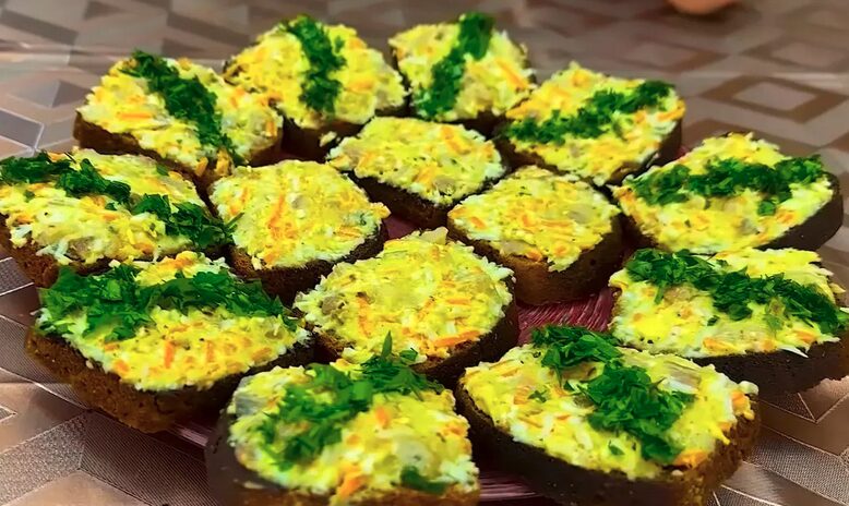 Užkandžiui: 12 juodos duonos riekelių, 1 silpnai sūdyta silkė (filė), 3 virti kiaušiniai, 150 g korėjietiškų morkų, 1 lydyto sūrio pakelis, 2 valgomieji šaukštai majonezo, 5 česnako skiltelės, druska ir malti juodieji pipirai pagal skonį, kelios petražolių šakelės.
