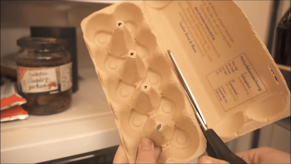 Paėmiau kartoninę kiaušinių dėžutę ir nupjoviau viršų. Liko apatinė dalis su įdubomis – dešimt mažų lizdų, idealiai tinkančių siauriems buteliukams.