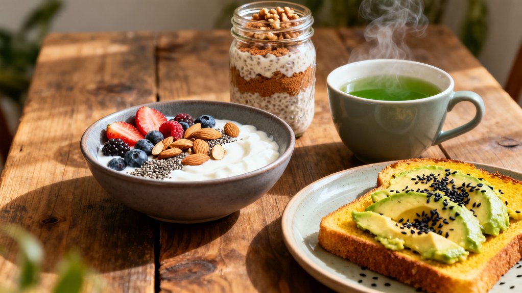 Šis pusryčių patiekalas, sudarytas iš viso grūdo skrudintos duonos, padengtos plonu riešutų sviesto sluoksniu ir supjaustyto avokado, yra sudėtingų angliavandenių, baltymų, sveikų riebalų ir skaidulų derinys, kuris padeda išlaikyti pastovų gliukozės kiekį kraujyje ir ilgalaikį sotumo jausmą. Įrodymai rodo, kad įvairių makroelementų derinys sulėtina skrandžio ištuštėjimą ir sumažina norą valgyti saldumynus viduryje ryto. Praktiškai, rinkitės minimaliai apdorotą duoną, nedidelį kiekį migdolų arba žemės riešutų sviesto ir pusę avokado, kad galėtumėte kontroliuoti porcijas ir kalorijas. Tekstūra ir skonis patenkina burnos pojūčius, kurie dažnai skatina norą valgyti saldžius užkandžius. Empatijos požiūriu, rekomenduojama pradėti nuo pažįstamų derinių ir per dvi savaites koreguoti porcijas, kad pastebėtumėte sumažėjusį norą valgyti saldumynus.