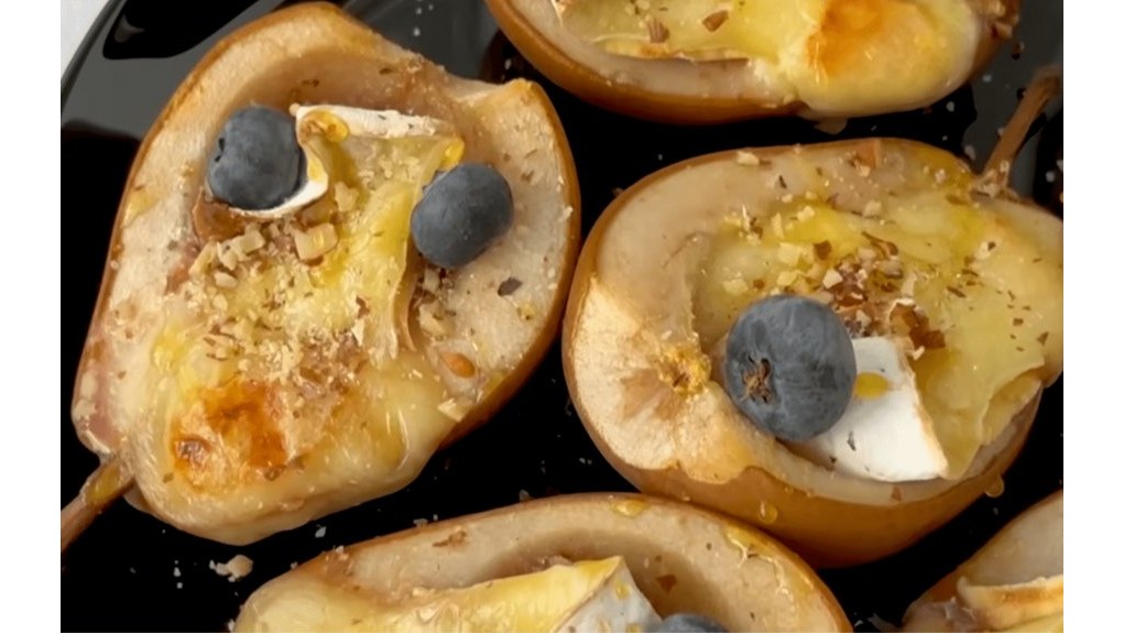 Patiekite desertą šiltą, kol camembertas dar tirpstantis. Kiekviena kriaušės puselė turėtų gulėti atskiroje lėkštelėje — taip svečiai galės mėgautis kontrastingomis tekstūromis: minkšta, karamelizuota kriaušė, tirpstantis sūris, traškūs riešutai.