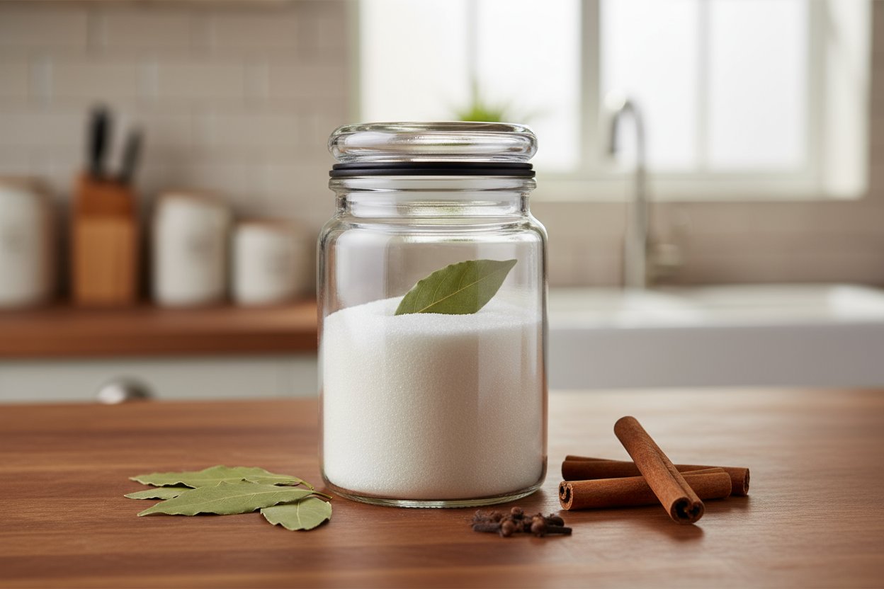 Vienas sausas lauro lapas uždarame cukraus inde išskiria koncentruotas lakiąsias aliejų, turinčias švelnias antiseptines ir vabzdžius atbaidančias savybes. Šios lakiosios medžiagos daro indo mikroaplinką mažiau patrauklią skruzdėlėms, vabaliukams ir kandims ir gali sulėtinti pelėsių sporų gyvybingumą, kai išlaikoma sausuma. Tai geriausiai veikia hermetiškuose stikliniuose arba maistui tinkamuose plastiko induose, kas mėnesį tikrinant lapus ir juos keičiant. Saugumo sumetimais venkite maišyti lapą su cukrumi ir išmeskite bet kokį sukepusį ar kvapų cukrų; toliau pateikiami praktiški patarimai.