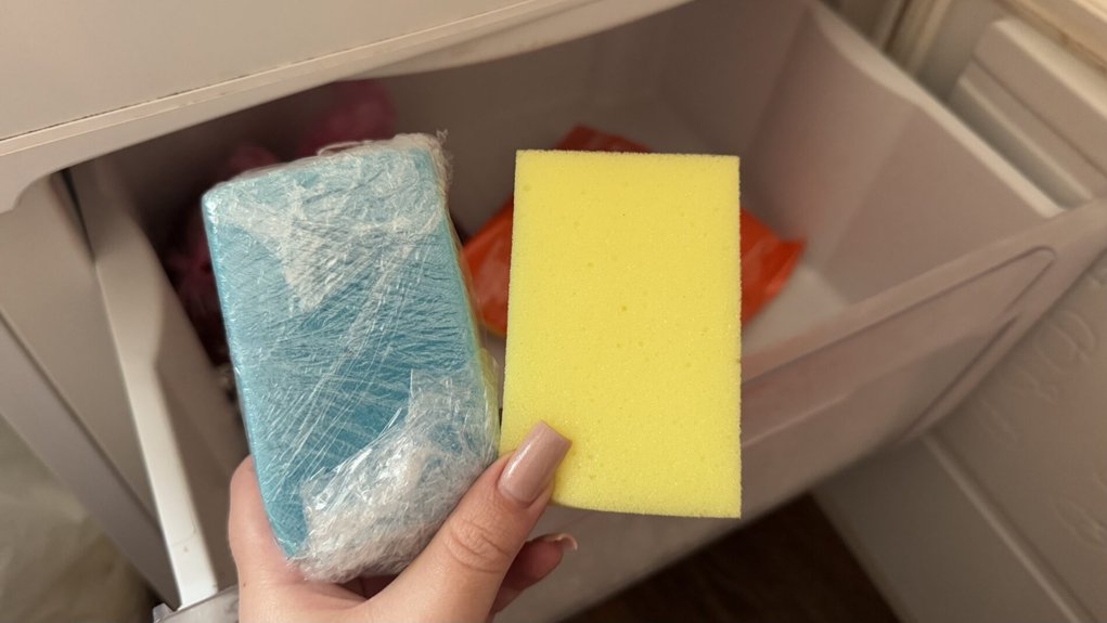 Tada prisiminiau triuką, kurį kažkada mačiau internete. Paėmiau keturias paprastas indų kempines, kiekvieną suvyniojau į maistinę plėvelę ir įmečiau į šaldiklį.