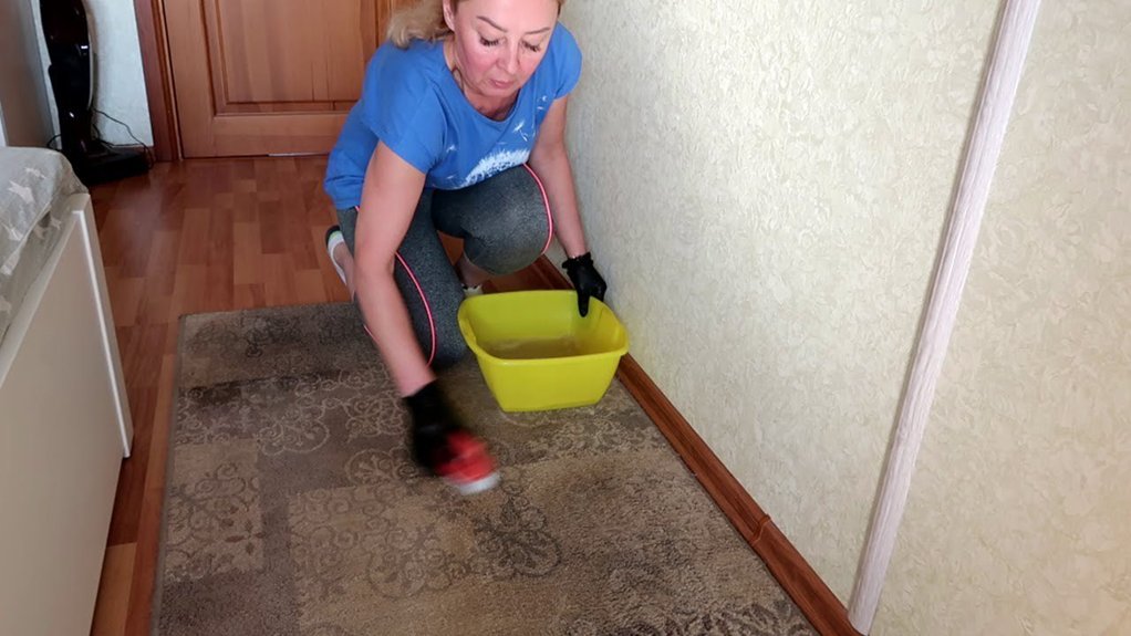 Paimkite seną dantų šepetėlį arba minkštą šepetį. Trumpais, tvirtais judesiais įtrinkite putas į kilimo pluoštą. Pajusite, kaip plaukai ir dulkės pradeda kilti į paviršių.