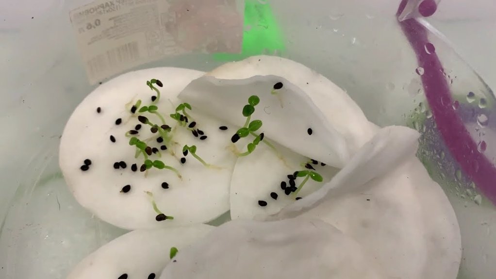 Po dešimties dienų pirmosios sėklos pradėjo skilti. Vienuoliktą dieną jau matėsi balti daigeliai – tokie mažyčiai, kad vos įžiūrėjau.