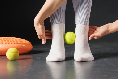 Teniso kamuoliukas – idealus įrankis pėdų fascijų treniruotei. Jo tekstūra ir kietumas puikiai tinka taškiniam masažui, kuris veikia tiek pėdos padus, tiek skliautą.