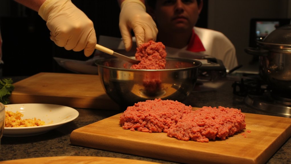 „Smulkiai supjaustytas svogūnas – tai drėgmės šaltinis,” aiškino šefas. „Kuo smulkiau – tuo tolygiau pasiskirsto, tuo daugiau sulčių išlaiko mėsa.”