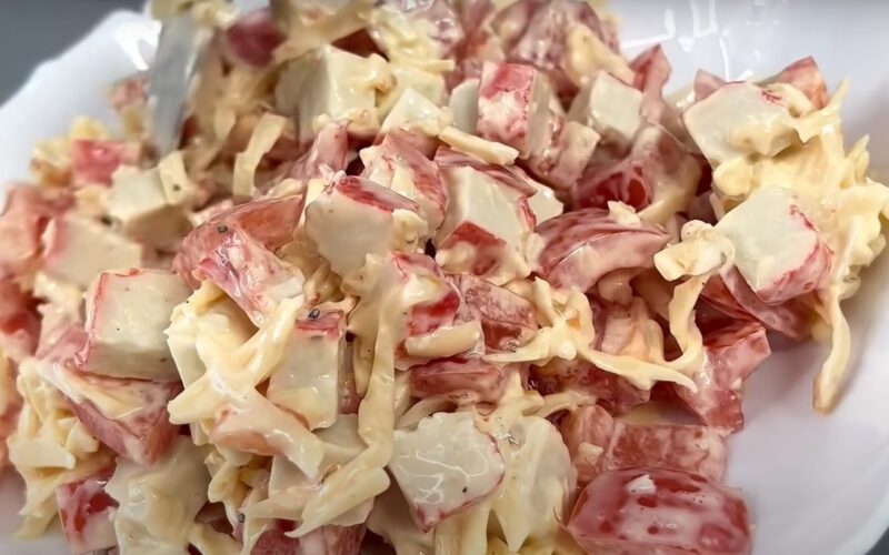 Pabandykite šias neįprastas salotas su krabų lazdelėmis ir naminiais skrebučiais – jos tikrai nustebins jūsų šeimą ir draugus savo šviežumu, tekstūra ir skoniu!