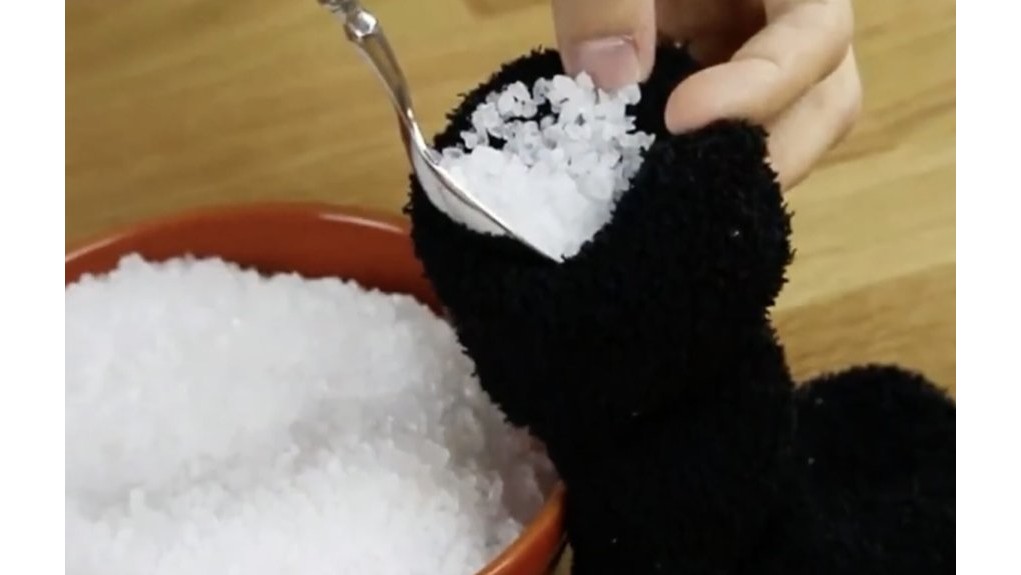 Kojinė atlieka dvigubą vaidmenį: leidžia orui cirkuliuoti aplink druską ir neleidžia jai išsibarstyt. Vilna ar storesnis medvilninis audinys veikia geriausiai – plonas sintetinis praleis per daug.