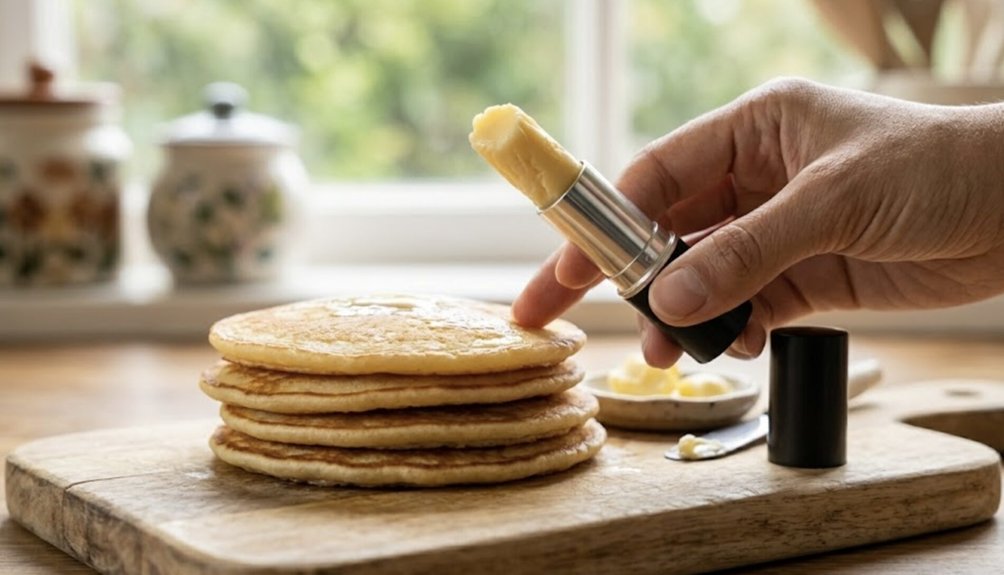 Idėja paprasta: išvalai tuščią lūpdažio tūbelę, užpildai suminkštintu sviestu, užsuki kamštelį. Ir laikai šaldytuve.