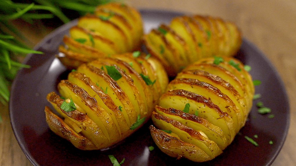 Iš šono atrodo kaip paprasta kepta bulvė. Bet kai paimiate į rankas, pamatote — ji tarsi vėduoklė, su dešimtimis plonų griežinėlių, kurie kepant atsivėrė ir apskrudo. Kiekviename plyšelyje — ištirpęs sviestas su česnaku ir žolelėmis.