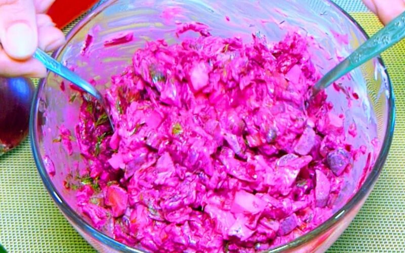 Iškepkite arba išvirkite burokėlius iki paruošimo, nulupkite ir sutarkuokite stambia tarka. Išvirkite kietai virtus kiaušinius, nulupkite ir taip pat sutarkuokite tarka.