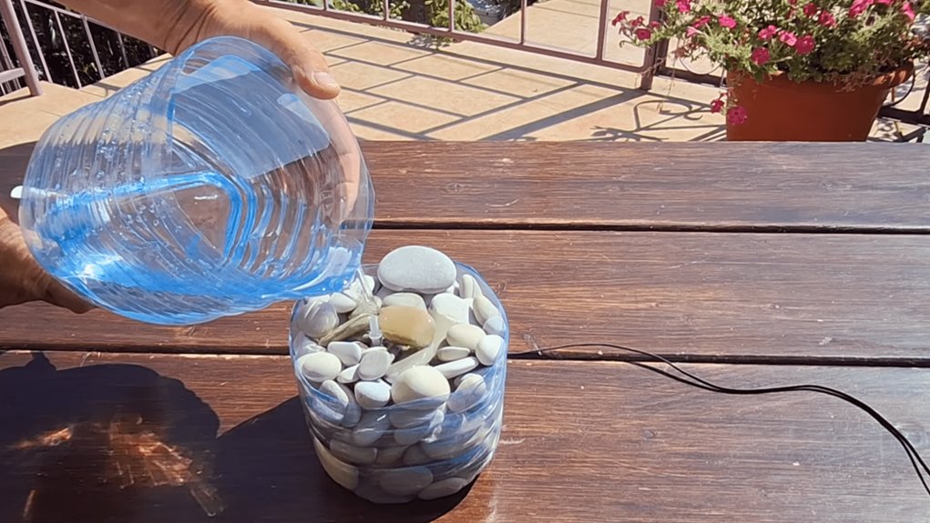 Siurblį pastatykite butelio pagrindo centre. Maitinimo laidą diskretiškai išveskite per baseino kraštą. Aplink siurblį išdėstykite akmenukus – jie stabilizuos įrenginį ir paslėps mechanizmą.
