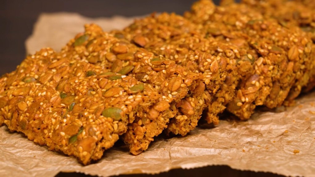 200 g avižinių dribsnių 120 g kvietinių miltų 80 g skysto medaus 60 g saulėgrąžų aliejaus (arba kito neutralaus aliejaus) 1 arbatinis šaukštelis smulkios druskos (apie 5 g) 1 arbatinis šaukštelis kepimo miltelių (apie 5 g) 20–30 ml vandens 30 g mišrių sėklų papuošimui (saulėgrąžų, moliūgų, sezamo)