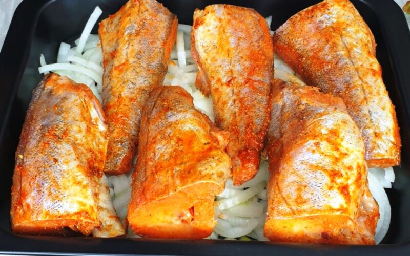 - Paliekame jūrų lydeką marinuotis pusei valandos. Tuo metu supjaustome svogūnus pusžiedžiais, dedame juos į kepimo formą.