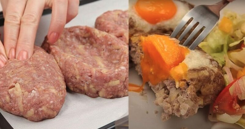 - Kepame kotletus orkaitėje 30 minučių 180 laipsnių temperatūroje. Po kepimo smulkiai sutarkuojame sūrį, pabarstome įdubime. Ten pat dedame po trynį, kepame kotletus dar 5-7 minutes.