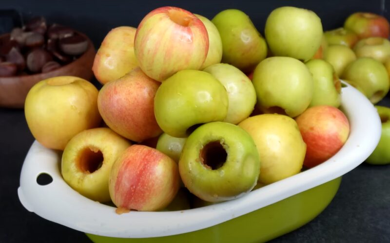 - Kruopščiai nuplaukite obuolius, iš kiekvieno pašalinkite sėklalizdžius.