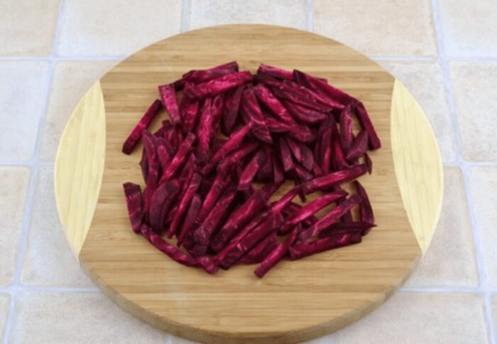 Burokus ir morkas išvirkite, nulupkite ir supjaustykite plonomis juostelėmis. Tokia forma leidžia daržovėms lengviau susigerti padažą ir išlaikyti malonią tekstūrą.