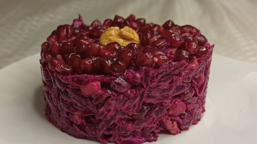Kas jose tokio ypatingo? Pažiūrėkite į lėkštę: tamsiai rausvos burokėlių juostelės, blizgančios granatų sėklos, primenančios mažus rubinus, ir auksiniai skrudintų riešutų gabaliukai. Spalvos tokios ryškios, kad atrodo, jog patiekalas sukurtas fotografuoti. Bet tikroji magija atsiskleidžia paragavus.
