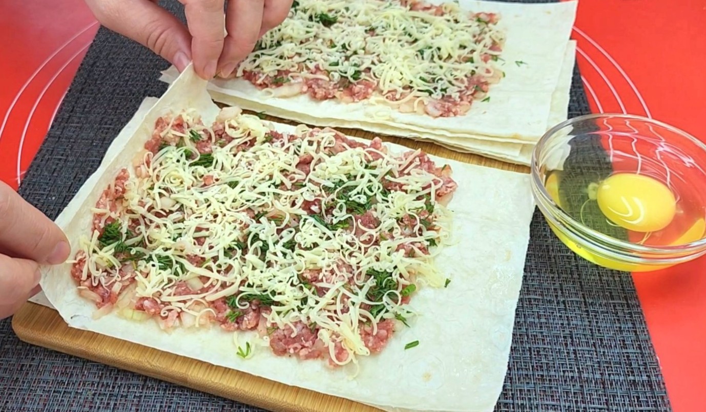 - Lavašus supjaustome į nedidelius stačiakampius. Ant jų paskirstome faršą, tolygiai paskleisdami visame paviršiuje, bet neprieindami iki kraštų 2-3 cm.