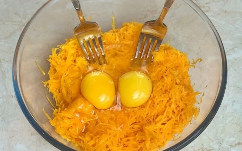 • Į tarkuotą moliūgą įmuškite 2 kiaušinius