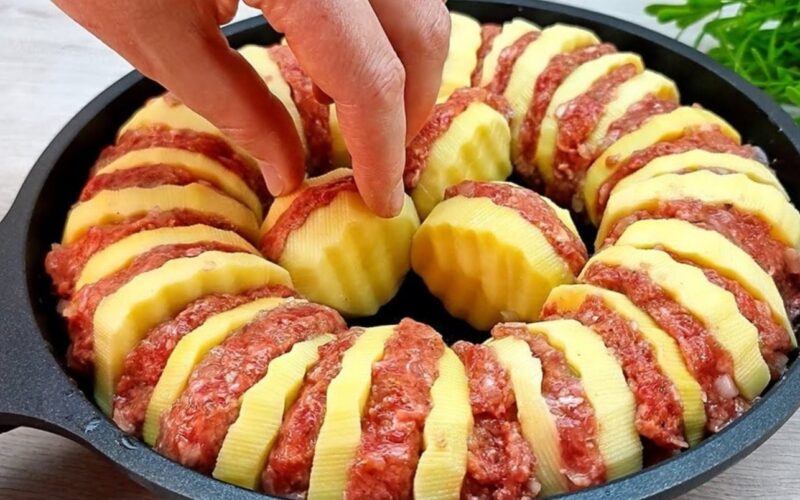 - Formuojame iš faršo nedidelius rutuliukus, kuriuos įdedame tarp dviejų bulvių griežinėlių. Faršą su bulvėmis dedame briaunomis į keptuvę, išdėliojame „sumuštinius” ratu.