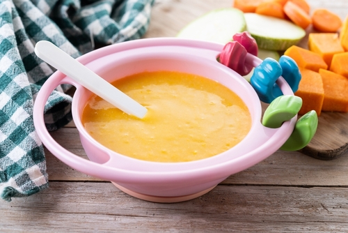 Daržovių tyrė: garintos ar keptos saldžiosios bulvės, morkos, moliūgai, sutrinti su nedideliu kiekiu motinos pieno, mišinio ar vandens.