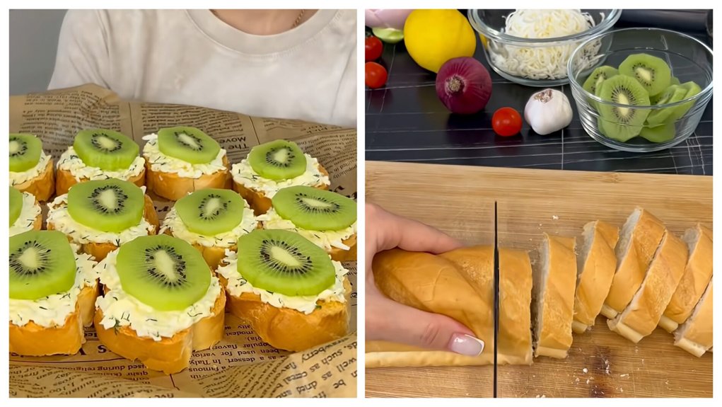 Paslaptis — netikėtas derinys. Šilta, traški duona su česnakiniu aromatu susitinka su vėsiu, kreminiu užtepu. O tada — prinokusio kivio griežinėlis, kuris viską apverčia aukštyn kojomis. Saldumas, rūgštumas ir sūrumas viename kąsnyje.
