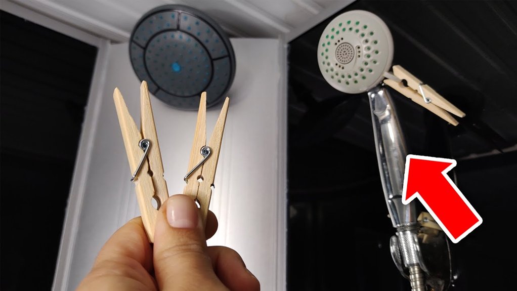 Geriausios vietos: dušo užuolaidos strypas, rankšluosčių laikiklis toliau nuo tiesioginio vandens srauto, lentynos kraštas ar veidrodžio rėmas. Svarbu, kad segtukas nebūtų tiesiogiai po dušo srautu – vanduo greitai išplaus aliejų.