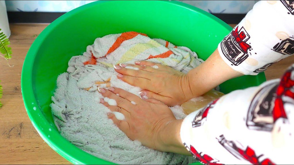2. Panardinkite rankšluosčius. Įsitikinkite, kad visas audinys po vandeniu – ne tik kraštai.