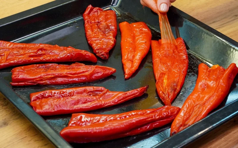 - Iškeptą foliją su paprikomis išskleiskite ir leiskite šiek tiek atvėsti. Nulupkite odelę – ji lengvai nusineša – ir supjaustykite plačiomis juostelėmis.