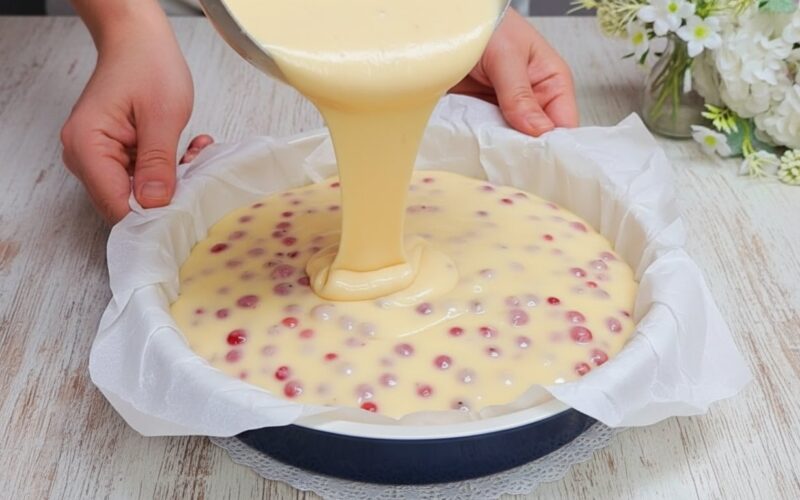 5. Kepimo formą išklojame kepimo popieriumi, supilame tešlą ant paviršiaus, tolygiai paskirstome.