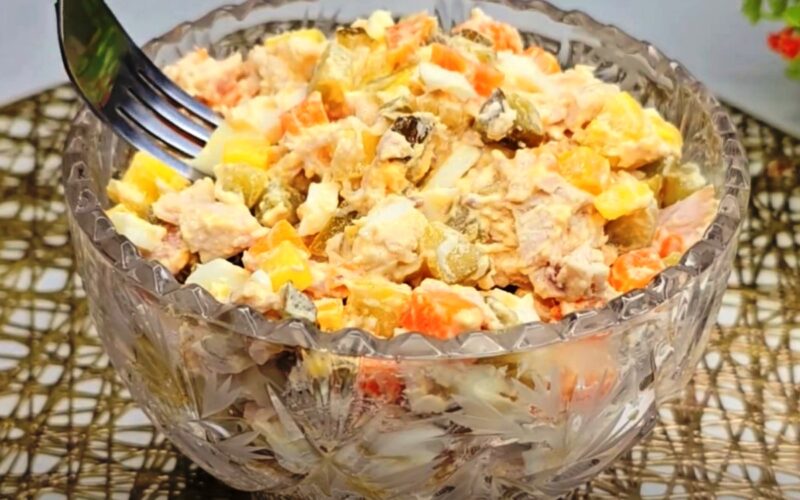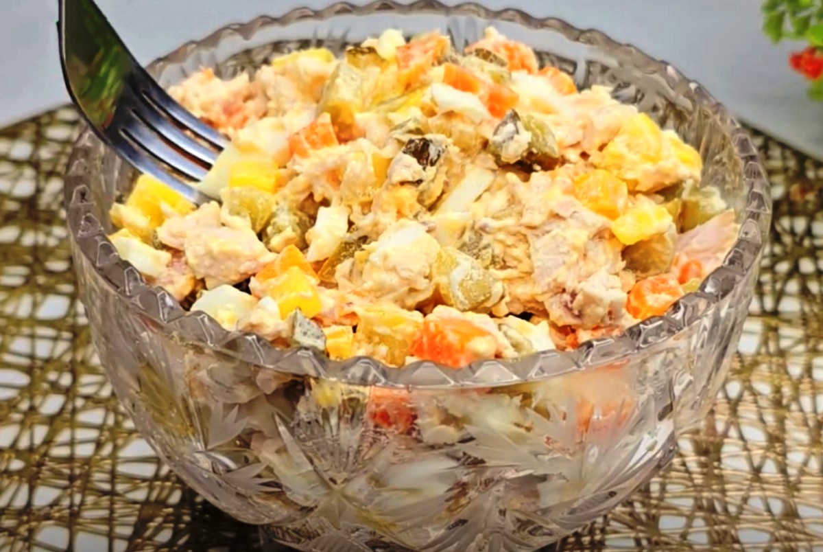 - Marinuotus agurkus supjaustome kubeliais ir sudedame į salotinę. Virtą vištieną smulkiai supjaustome ir dedame prie agurkų. Kubeliais supjaustome morkas ir sumaišome su kitais ingredientais.