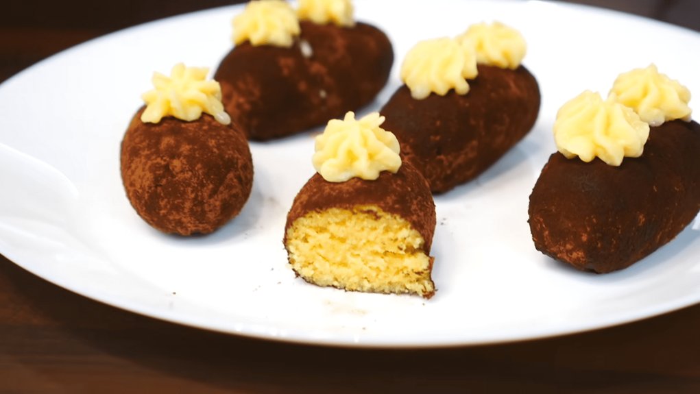 Šį desertą geriausia valgyti dar šiltą arba kambario temperatūros – tada kremas viduje minkštas ir tirpstantis. Jei norite šaltesnio varianto, pastatykite „bulvytes” šaldytuve 30 minučių.